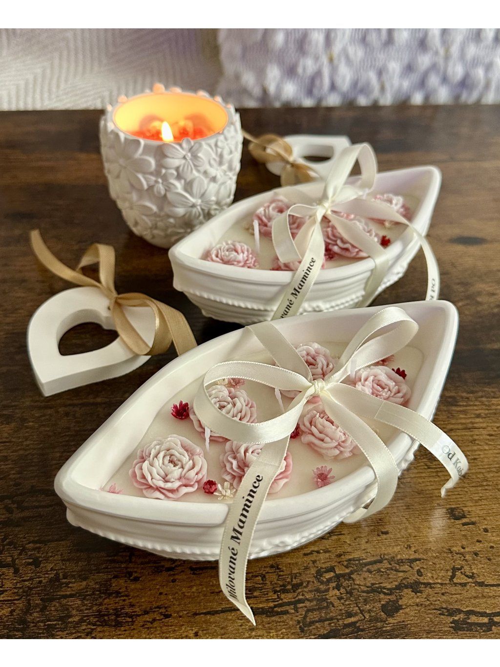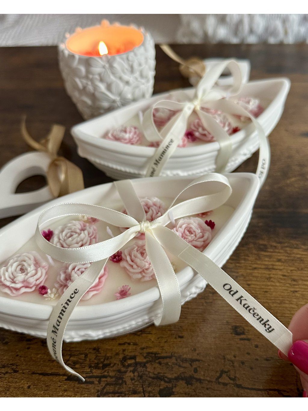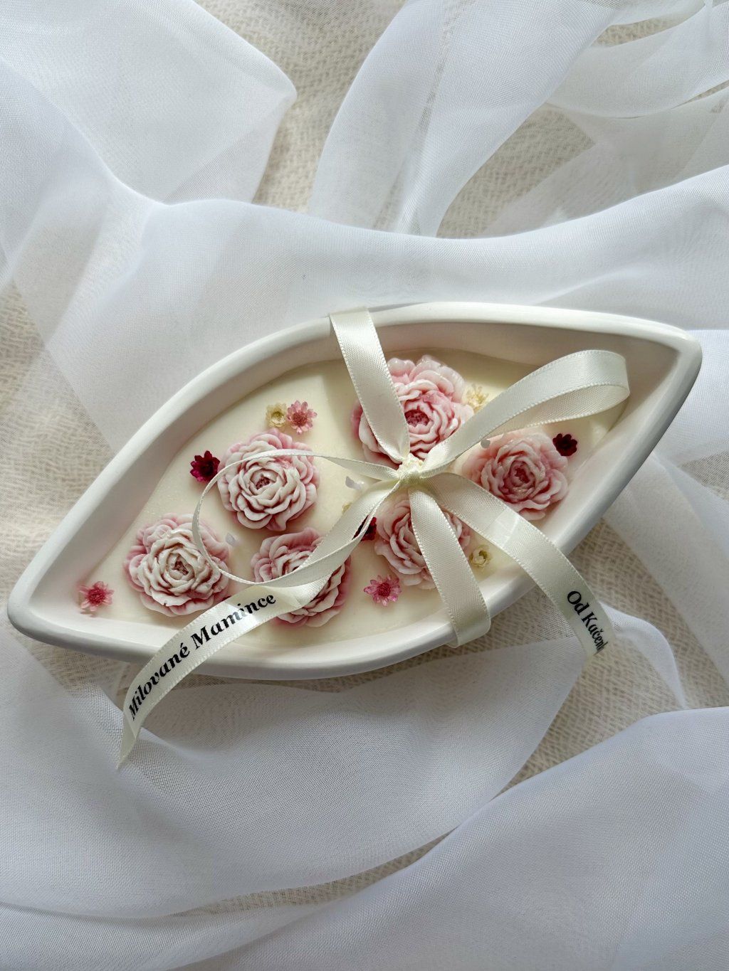 Jemná ručně vyráběná svíčka s květinovým zdobením, vytvořená s důrazem na detail a jemnou atmosféru.