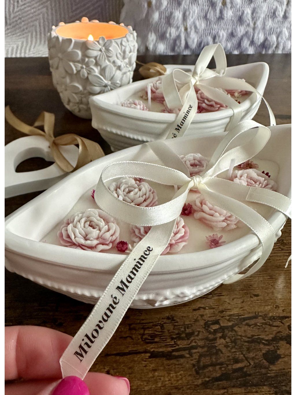 Tahle jemná, ručně vyrobená svíčka s květinovým zdobením není jen krásná dekorace – je to malý okamžik lásky. Každý kus je originál, vytvořený s péčí, aby potěšil přesně tu, která si zaslouží něco výjimečného.